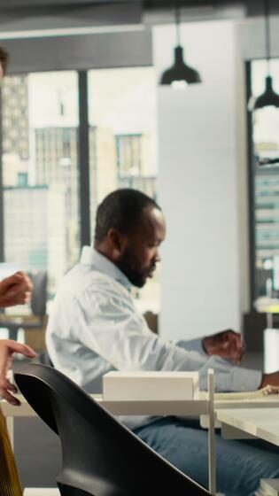 Vertical Business staff in modern office sharing insights and reports with colleagues, team focuses on data visualization for efficient resource allocation. Company administration at workplace. Camera B. Pro Video