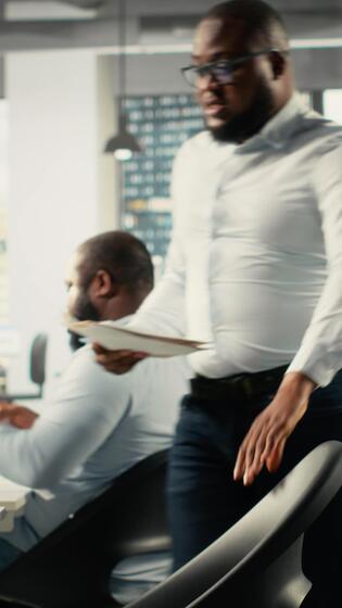 Vertical Group of coworkers engaged in consulting and report sharing at office. Professional team reviews visual data and documents to enhance business strategy and performance goals. Camera B. Pro Video