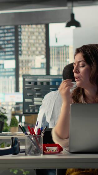 Vertical Business people reviewing diagrams during report writing in office. Colleagues in multinational company share insights and coordinate tasks using pc and visual data tools. Camera B. Pro Video