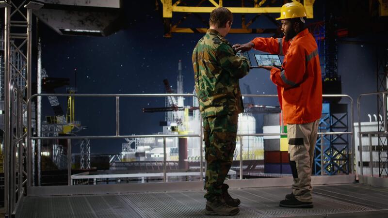 Security officer in camouflage uniform monitors offshore drilling operation, using radio communication for intelligence coordination and threat detection in maritime environments. Camera A. Pro Video
