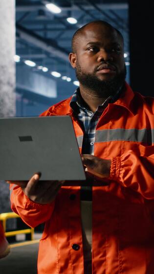 Vertical Technician manages operation procedures with handheld laptop, highlighting engineering responsibility and labor strength while he walks around on the factory floor. Workshop fabrication. Camera B. Pro Video