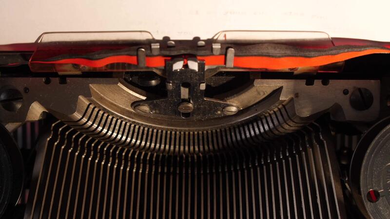 Close up top view of an old manual typewriter displaying its intricate mechanical typebars, paper, and ink ribbon, symbolizing writing and classic communication Pro Video
