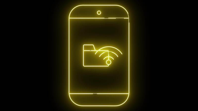Yellow neon outline of a smartphone displaying a file sharing icon set against a stark black background Pro Video
