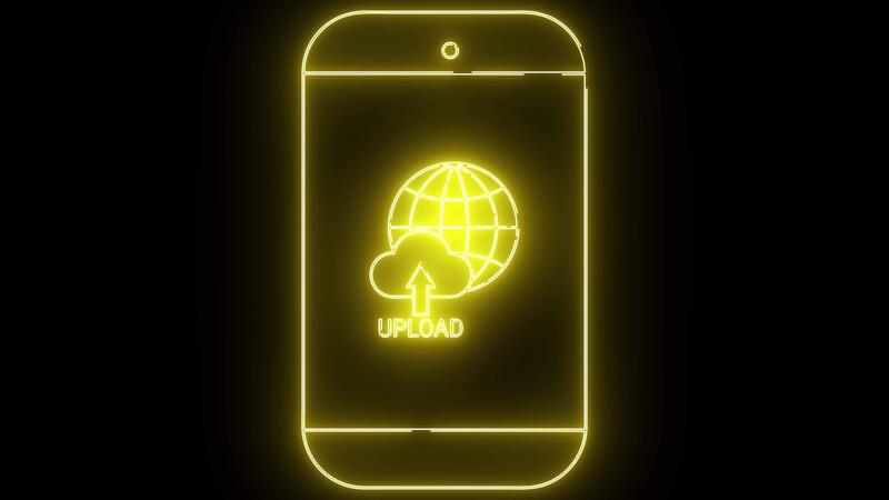 A yellow neon line art image depicts a phone with an upload icon of a globe cloud and arrow on a black backdrop Pro Video