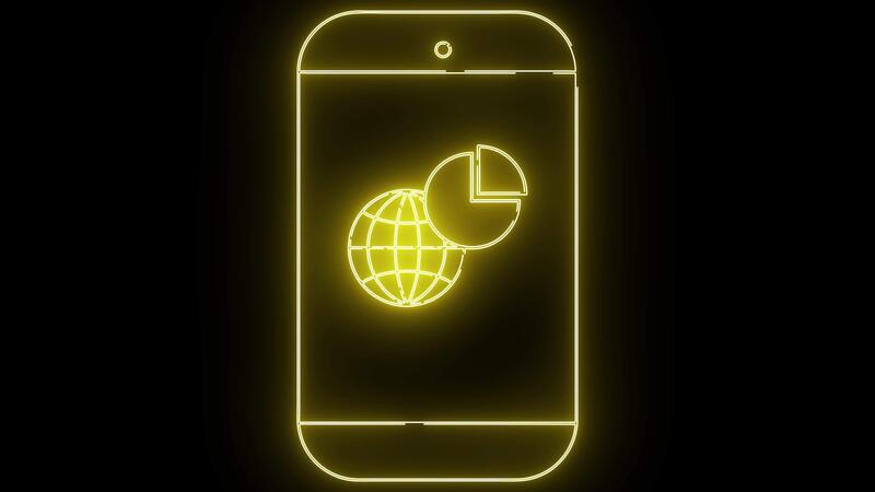 A yellow neon outlined phone with a globe and pie chart is centered on a black background Pro Video