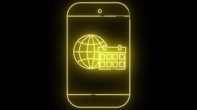 Illuminated yellow outline of a smartphone displaying a globe and a calendar on its screen against a stark black backdrop Pro Video