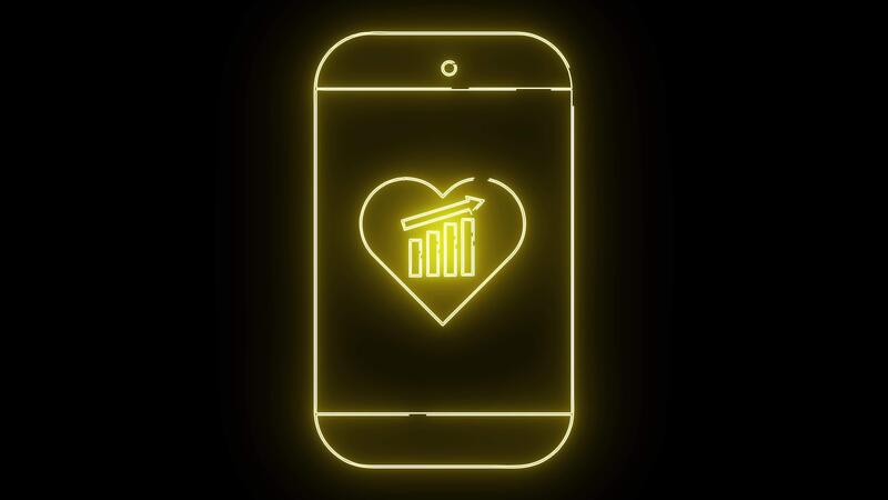 Glowing yellow neon outline of a phone displaying a heart with a graph and arrow inside Pro Video