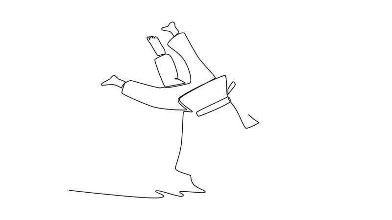 Animated self drawing of continuous line draw two men are performing dynamic hip throw, with one figure inverted in mid-air during execution of Judo or martial arts. Full length single line animation Pro Video