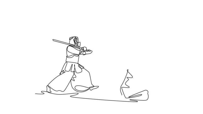 Animated self drawing of continuous line two men Kendo athletes in full bogu armor are engaged in tense sword defense and attack. Dynamic sparring of martial arts. Full length one line animation Pro Video