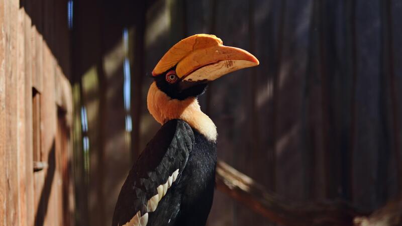A bird with a large yellow beak sits on a tree branch. A zoo with flying birds with free access to birds. A park for toucans. Pro Video