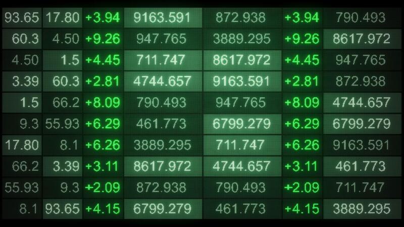 Seamless loop 3D animation of a stock market quotes table with green positive changes in grid layout on a dark screen, ideal for trading, finance, news, and analytics. Pro Video