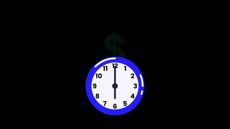 Time turns into money animation dollar icons appearing as the clock hand moves, symbolizing productivity, profit growth, financial value, and efficient time management with transparent background Pro Video