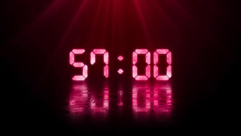 Red glowing digital countdown timer reflected on dark surface under soft overhead light. Technology concept Pro Video