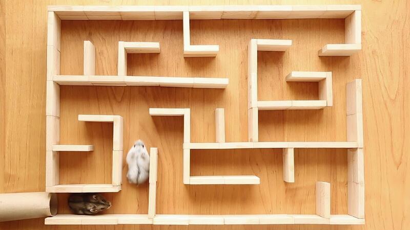 Small, diverse hamsters run out of the pipe into the maze. Pro Video