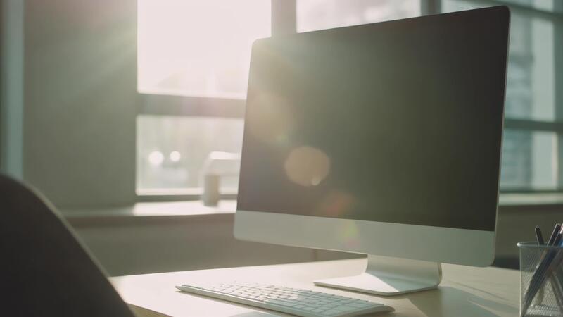 Modern office desk with an empty desktop computer and keyboard, bathed in bright morning sunlight. Lens flares on screen create a productive workspace. Free Video
