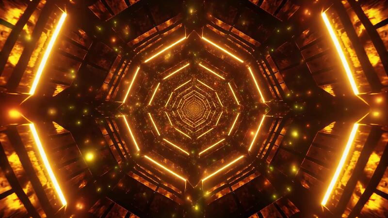 Futuristic glowing orange gold neon light tunnel with shimmering particles and hypnotic hexagon shape design creating an abstract endless loop animation background Free Video