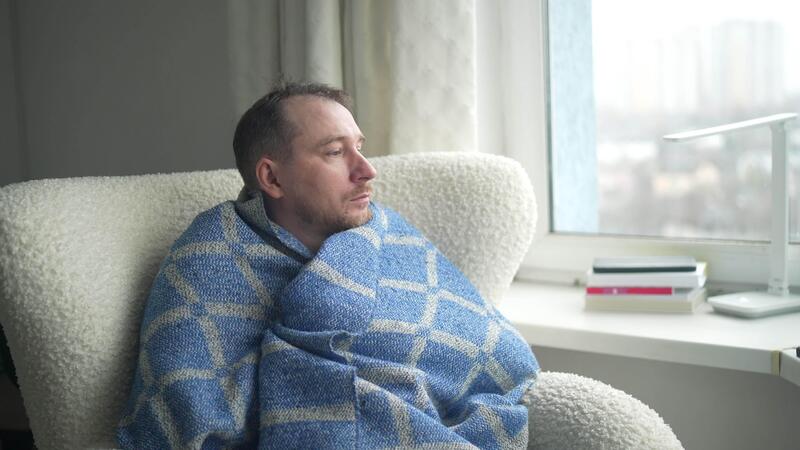 Man enjoys a quiet moment by the window while wrapped in a cozy blanket on a chilly day Pro Video