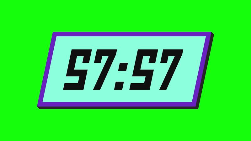 Digital countdown timer from 58 minute to 57 minute on a tilted rectangular display with a green background Free Video