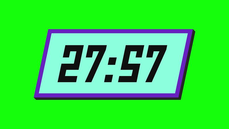 Digital countdown timer from 28 minute to 27 minute on a tilted rectangular display with a green background Free Video