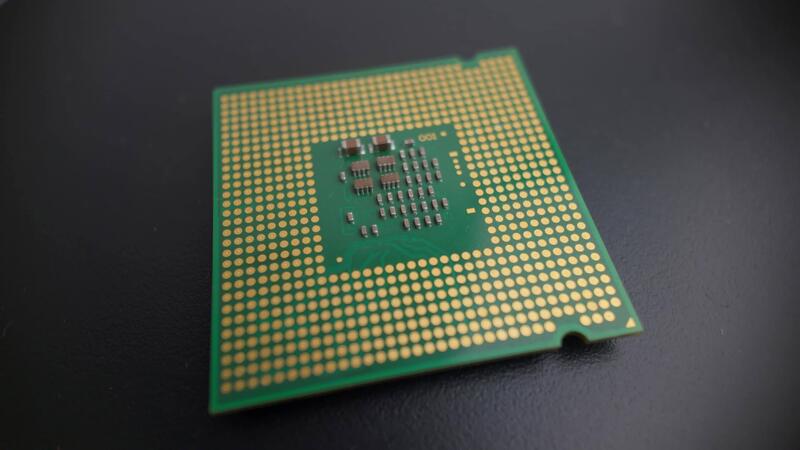 Macro rotating view of a modern CPU underside without pins, showing contact pads and processor structure for hardware, electronics and tech presentations Pro Video