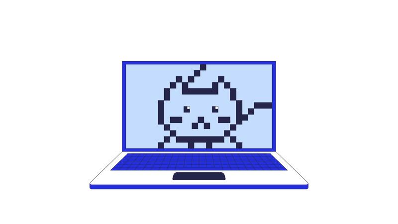 Pixel art cat displayed on laptop screen 2D cartoon object animation. Pixelated kitty looking side to side. Tech nostalgia. Internet culture animated flat colorful item 4K isolated on white Pro Video