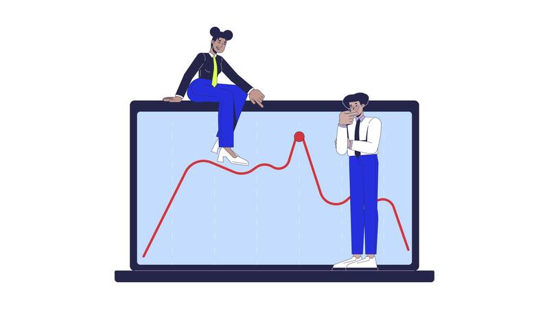 Analysts team analyzing peak of data trend 2D animation. Diverse statisticians focusing on red line graph laptop screen animated characters cartoon flat concept metaphor 4K isolated on white Pro Video