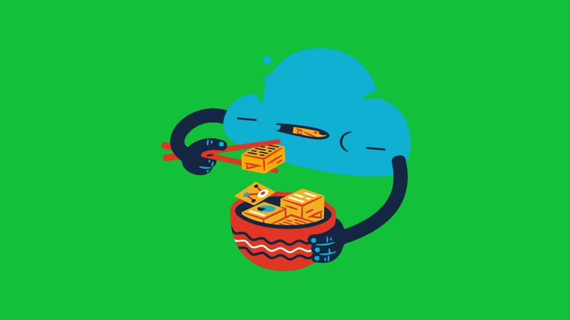 Cartoon Cloud Character Eating Data Blocks with Chopsticks from a Bowl, Representing Cloud Computing and Data Consumption Pro Video