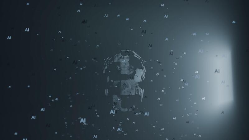 Abstract Wireframe AI Face Emerging from a Cloud of Floating Digital Particles Pro Video