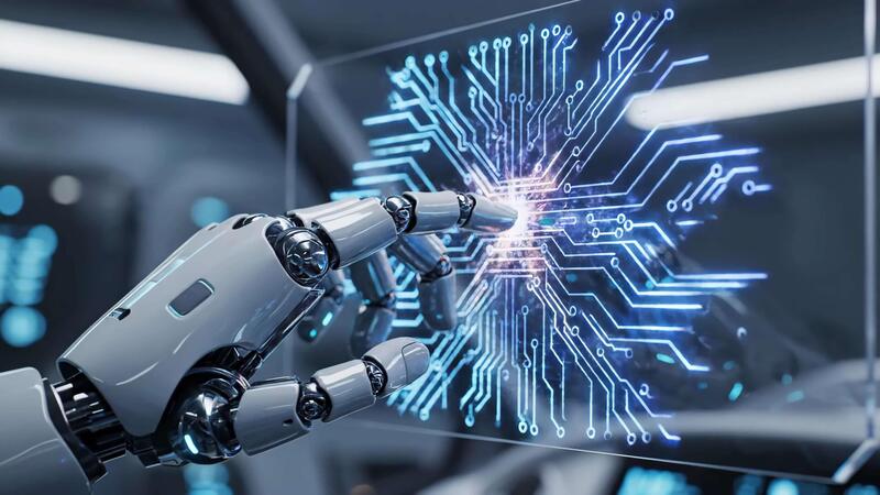 Modern robotic hand interacting with futuristic interface, hinting at AI innovation and technological advancement in sleek, dynamic motion Free Video