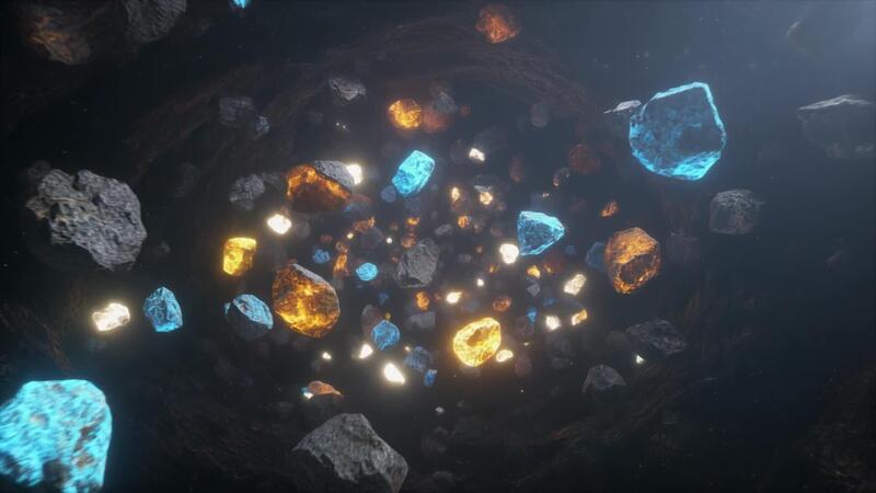 Dynamic digital animation of glowing colorful rocks drifting through dark space with varied textures and vivid luminescence creating a surreal modern abstract scene Pro Video