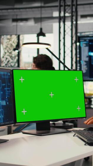 Vertical Green screen mockup PC used by data scientist in office automating workflows with artificial intelligence. IT worker refines deep learning models on chroma key computer for faster processing, camera A Pro Video