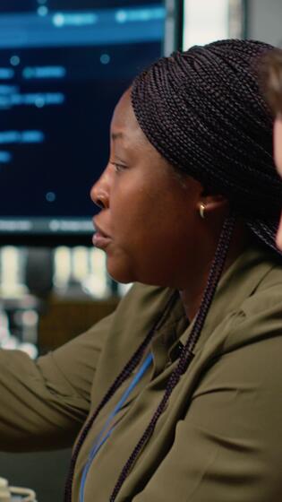 Vertical Software developers in startup office brainstorming leveraging AI tech to gain competitive edge. Teamworking colleagues doing meeting to discuss training deep learning predictive models, camera B Pro Video