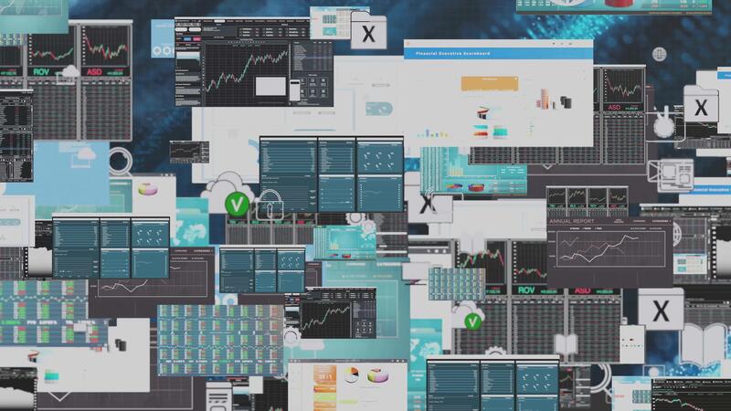 Turntable animation showing financial stock market charts and business analytics dashboards. Rotating videowall collage of screens presenting economic data graphs and trading interface statistics Pro Video