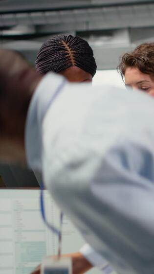 Vertical Female engineers in startup office using AI technology driving market innovation. Women working together in tech agency, applying machine learning to optimize operations and efficiency, camera B Pro Video