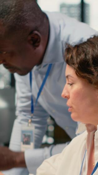 Vertical Manager supervises intern in startup office using artificial intelligence driving market innovation. Tech agency team leader shows trainee how to to optimize operations with machine learning, camera B Pro Video