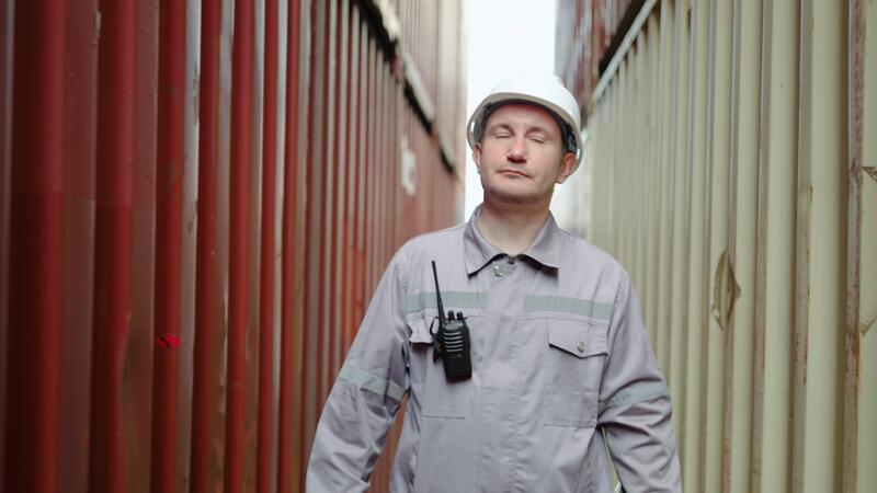 Caucasian engineer foreman walks through stacks of shipping containers, using a laptop computer to check inventory and ensure smooth loading operations at the cargo freight dock. Pro Video