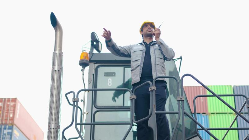 Logistic or engineer man talking on walkie-talkie explain project with colleague on forklift in container warehouse. inspecting for quality control. shipping delivery and export import Pro Video