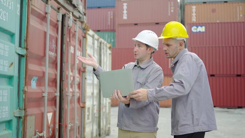 Two professional caucasian engineers dressed in safety uniforms review logistics operations on a laptop computer at a container terminal. They discuss strategies for improving workflow and safety Pro Video