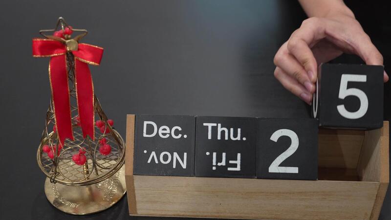 Decorative calendar with red ribbon, daily date display, and festive ornament on wooden table background Free Video
