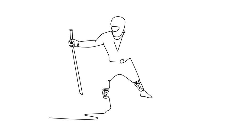 Self drawing animation of single line draw man ninja poised in wide combat stance, wielding twin sword in wide guard, illustrating dynamic combat, focused action. Continuous line. Full length animated Pro Video