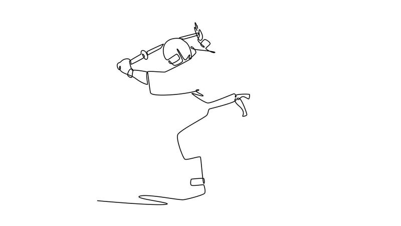 Animated self drawing of continuous line draw young man ninja in mask, crouched low, preparing powerful overhead strike with a katana sword, illustrating dynamic action. Full length one line animation Pro Video