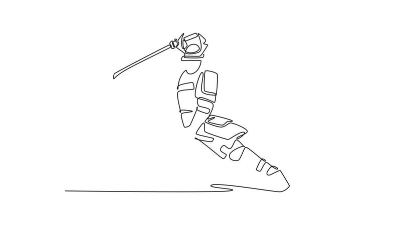 Self drawing animation of single line draw samurai in full armor, lunging forward with two swords in powerful attack pose. Decisive action and historical warfare. Continuous line. Full length animated Pro Video