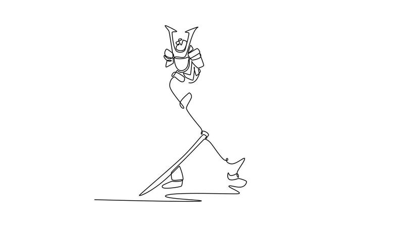 Self drawing animation of single line draw powerful samurai in full armor positioned in low, stable stance with katana pointed down. Moment of readiness, defense. Continuous line. Full length animated Pro Video