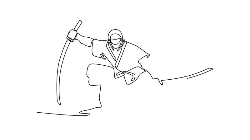 Self drawing animation of single line draw man ninja poised low in wide stance wielding twin sharp katanas, illustrating dynamic combat and focused action. Continuous line draw. Full length animated Pro Video