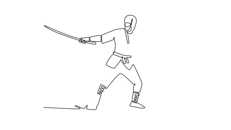 Self drawing animation of single line draw man ninja poised in wide stance, wielding twin katanas in defensive guard, illustrating dynamic combat, focused action. Continuous line. Full length animated Pro Video