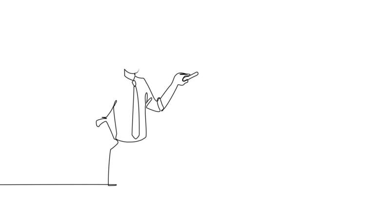 Animated self drawing of continuous line draw male presenter explaining volatile finance chart to seated audience, symbolizing business meeting or training strategy. Full length single line animation Pro Video
