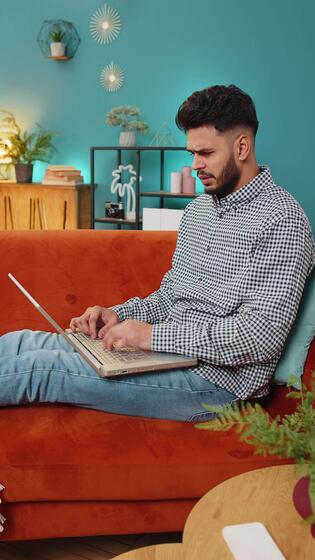 Frustrated Indian man having software problems with laptop angry guy nervous seeing error or mistake notification at computer screen mad employee experience virus attack or app malfunction. Vertical Pro Video