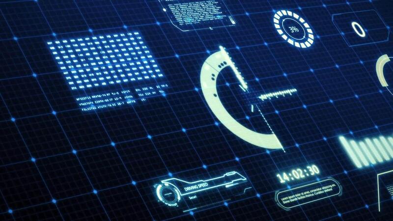 Futuristic Digital Interface with Data Processing and Analysis on a Dark Background. Pro Video