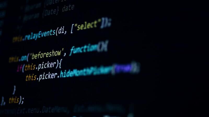 Macro closeup of JavaScript code scrolling across dark monitor. Pro Video