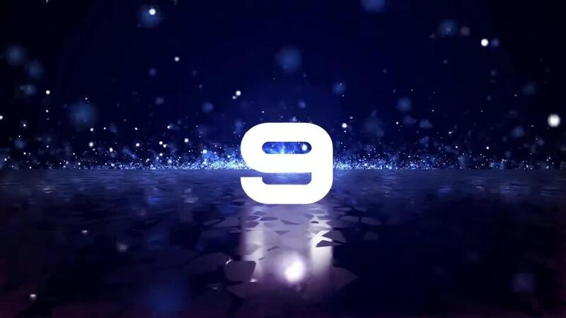 Abstract particle light trails and glowing number five on dark blue background with reflections futuristic digital countdown. Pro Video